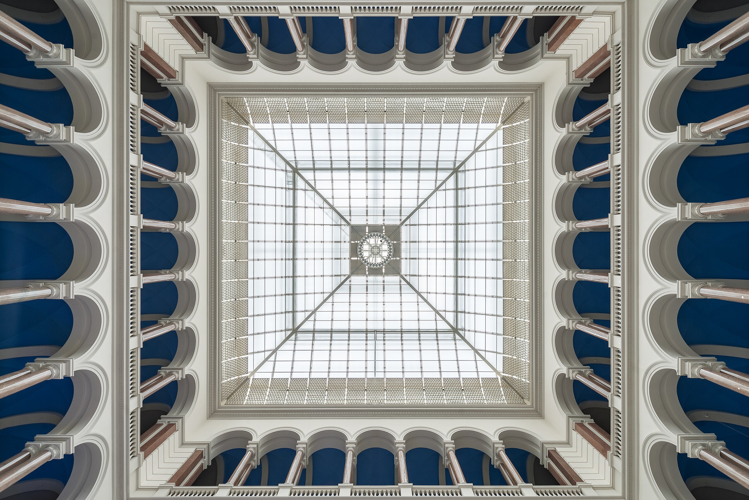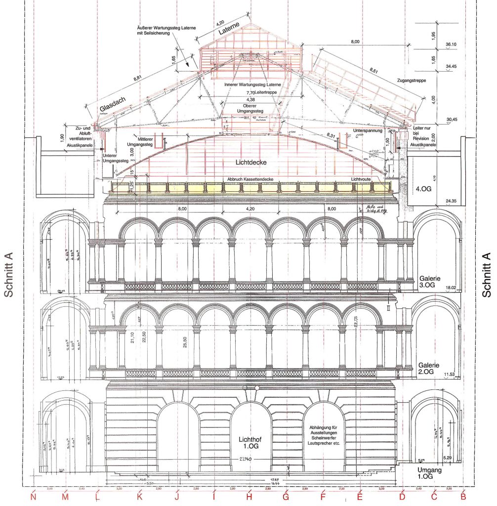 Im Rahmen der Instandsetzung wurde die ursprüngliche Raumdimension des Lichthofes zurückgewonnen. Das äußere Glasdach erfüllt alle heutigen technischen und bauphysikalischen Ansprüche: Unterkonstruktion aus Rohrprofilen und Isolierverglasung mit thermisch getrennten Profilen, Laterne zur senkrechten Montage der Rauchabzugsöffnungen, mechanische Lüfter in der Außenwand der Ost- und Westseite. Die moderne Lichtdecke wurde in die alte Geometrie der bauzeitlich überkommenen Tragkonstruktion integriert. Eine Lichtvoute ersetzt das kriegszerstörte, große hölzerne Gesims (Auszug aus der Projektbeschreibung, Pitz & Hoh).