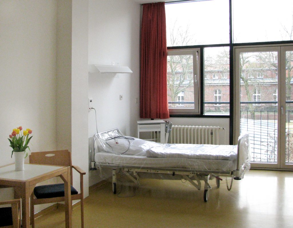 Der Umbau der Stationen bei laufendem Krankenhausbetrieb erforderte es, dass stationsübergreifend in der Umbauphase an-grenzende Nachbarstationen zeitweise gesperrt werden mussten. Um die vollständige Bettenkapazität der in Betrieb befindlichen Stationen während der Bauphase zu gewährleisten, wurden im 1.OG für die Dauer der Bauzeit Räumlichkeiten für die Unterbringung von insgesamt 9 Interims-Betten baulich hergerichtet.