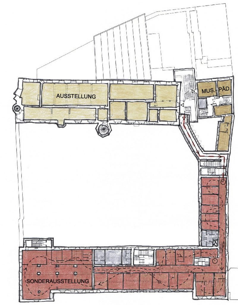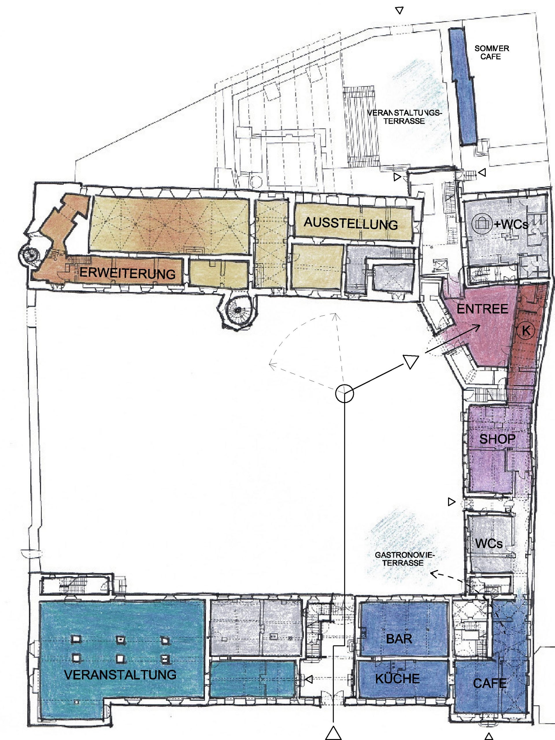 Ein solcher Entwurfsansatz konnte nicht losgelöst von den jetzigen und für die Zukunft auch zu erhaltenden Funktionen entwickelt werden. Das heißt, dass im Einzelnen neben den Überlegungen für die Umbauten im Augusteum auch die Nutzungsüberlegungen zum Lutherhaus, zum Direktorenhaus und zum Eingangsgebäude überprüft und berücksichtigt worden sind.